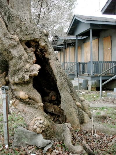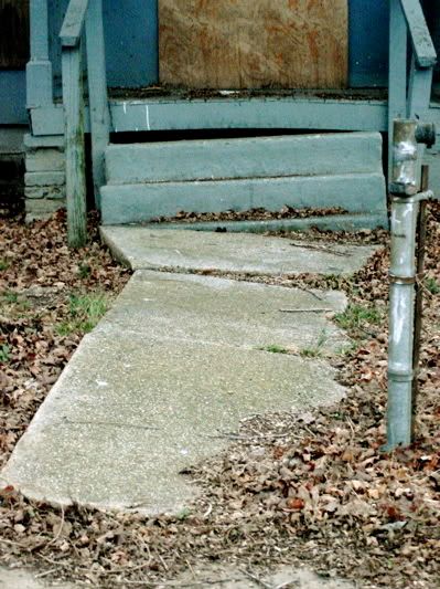 Crooked front path, graffiti mail box, and a tree that looks like a host for some sort of weird creature.